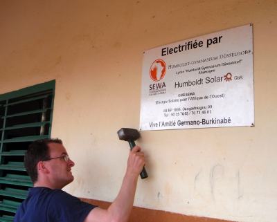 Zusammen mit den Eltern und Schülern des Humboldt-Gymnasiums und der Organisation "SEWA - Sonnenenergie für Westafrika e.V." haben wir den Aufbau einer kleinen Solaranlage auf einer Schule in Burkina Faso ermöglicht. Die Grundschule Saya wurde am 10. und 11. Juni 2009 elektrifiziert. Von zwei Technikern der burkinischen Firma MicroSow wurde ein Photovoltaiksystem installiert, dessen Herzstück ein 70-Wp-PV-Modul ist. Desweiteren besteht die Anlage aus einer wartungsfreien Solarbatterie, einem Laderegler und sechs 12-V-Energiesparlampen. Während die Techniker das Solarsystem installierten, trafen sich die SEWA-Mitarbeiter mit dem Direktor der Schule sowie den Lehrern und den Vertretern der Elternorganisation und bereiteten sie darauf vor, gemeinsam die Verantwortung für die Solaranlage zu übernehmen. Die Schüler können nun auch abends Ihre Hausaufgaben bei flackerfreiem Licht machen, und Unterricht ist bis in die Abendstunden möglich.